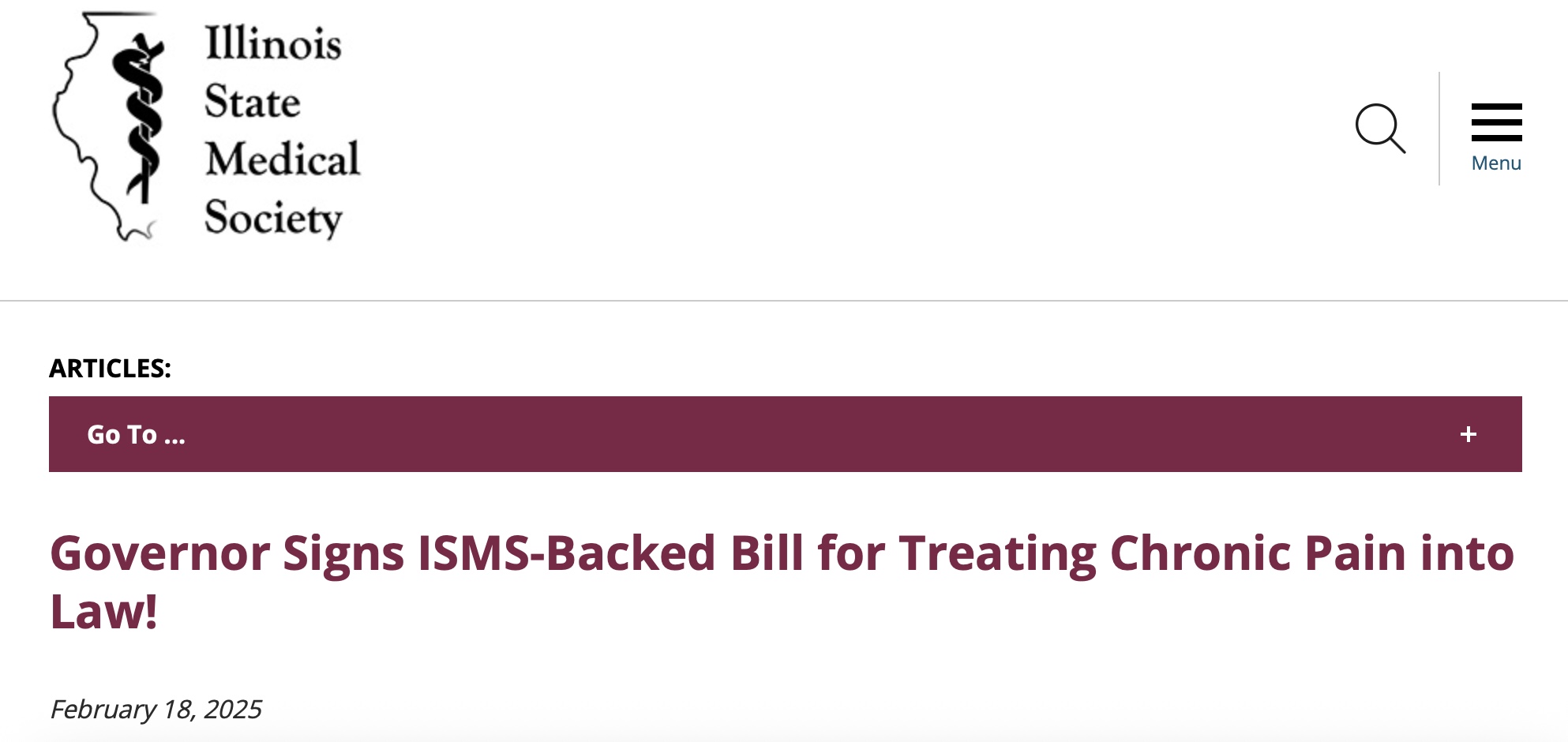 This year, Illinois adopted HB 5373, a bill to protect chronic pain patients and the healthcare professionals who treat them. HB 5373 has given many patients and doctors breathing room and has helped a lot of patients in other states access the care they may need in Illinois. We're proud to announce that HB 5373 has been partially implemented by Washington state, and other states are adopting new laws and policies that are modeled on that bill. In fact, there has been a discussion at the federal level about using Illinois's bill as a model. We were very excited to see Pain Medicine News, one of the leading publications for pain doctors and their patients, write about Illinois's new law and the protections it offers. If you're in Illinois, make sure you have a copy of the new law, which you can find here, and it's also a good idea to bring this article to the doctor if you need to help let someone know that the law has changed to protect your doctor and you. If you don't have an account to login to Pain Medicine News, you can create one for free to read about what Illinois did, which was pretty amazing--the bill passed UNANIMOUSLY and along bipartisan lines in the five votes it had in committees and on the House and Senate floors! Thanks to everyone who helped make Illinois's new law a reality, especially Representative Kelly Cassidy, who went out of her way to make sure that the chronic pain community is protected. We'll continue to work with Rep. Cassidy and the Illinois State Medical Society, which supported the bill (you can read about that here), to create new protections for pain patients and healthcare professionals in Illinois and elsewhere. We're grateful to Governor Pritzker for signing it and for the support of many organizations, from the American Medical Association to the World Sickle Cell Federation. In addition to the new law, the administrative agencies changed their guidance, so we do not rely on MME or the CDC anymore; instead, we follow the Federation of State Medical Board's (FSMB) 2024 Guidelines for Prescribing Opioids for Chronic Pain, which are flexible, patient-centered, and protect doctors who know that some patients need opioids to treat their pain, and no doctor acting in good faith or in the legitimate course of practicing medicine should be punished for helping the pain community. The United States' Supreme Court stated in another unanimous decision, U.S. v. Ruan, that doctors who prescribe along the lines mentioned above should not be penalized, but some courts are still getting it wrong, and unfortunately, the same is true for certain law enforcement agencies. With Illinois's new law, law enforcement cannot go on a "fishing expedition," trying to find doctors who prescribe pain medicine and punishing them for that reason alone, and MME guidance is no longer in use. Way to go, team!