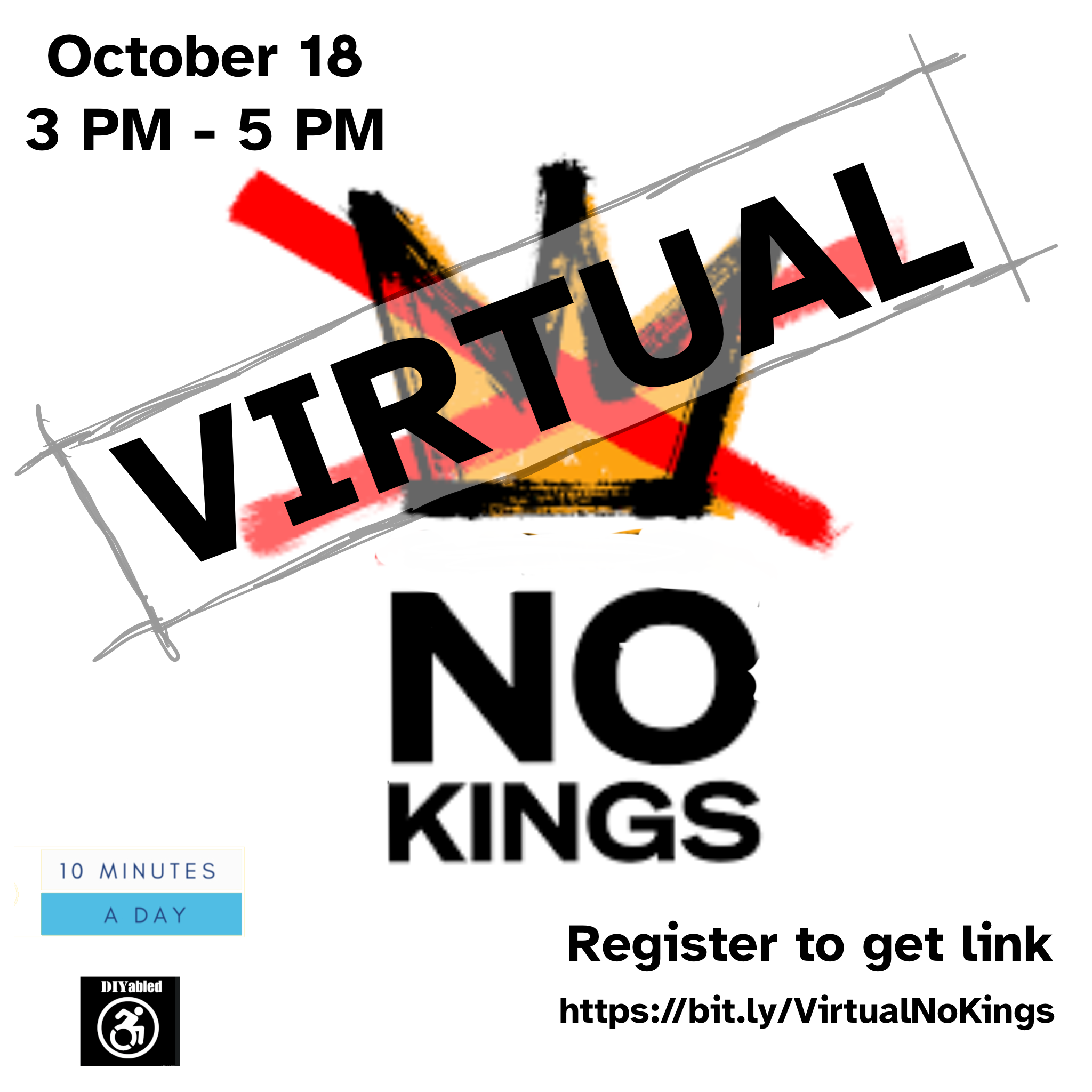 10 Minutes A Day & our partner nonprofit, DIYabled are disability community led & focused groups that have teamed up for #HandsOff & other events, making them virtual, so that accessibility is prioritized. We know that not everyone can attend a protest, & in our community, it's common for us to encounter obstacles that prevent us from being able to fully participate in many in person activities. In solidarity with & support of the disability justice movement, we will have a virtual #NoKings event on Saturday, October 18, 2025. Check out how you can join us!